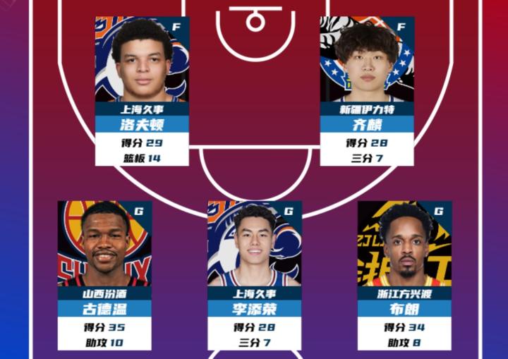 数据领先者方面,山西汾酒球员古德温以单场35分的数据领衔得分榜;