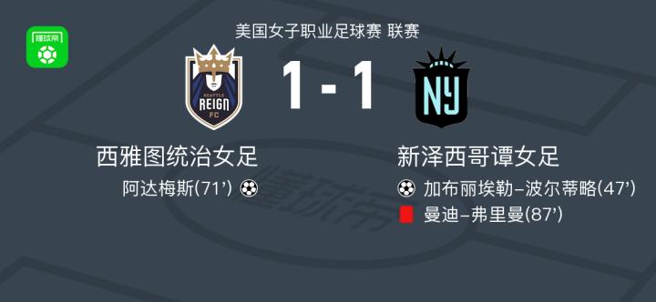 西雅图统治女足1-1新泽西哥谭女足,加布丽埃勒-波尔蒂略打破僵局,阿达梅斯扳平