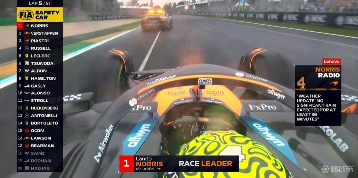 诺里斯的工程师告知车手:在接下来的30分钟里不会有明显的降雨,每个车队都需要精准地评估轮胎的使用与更换时机!