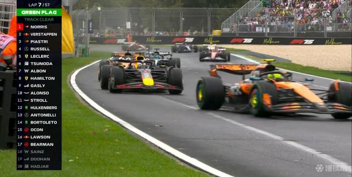 起步方面:诺里斯起的还不错,维斯塔潘在第1圈超越皮亚斯特里,勒克莱尔上到第5