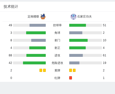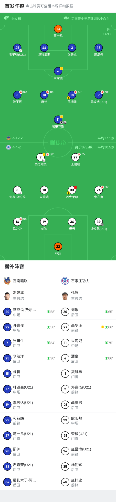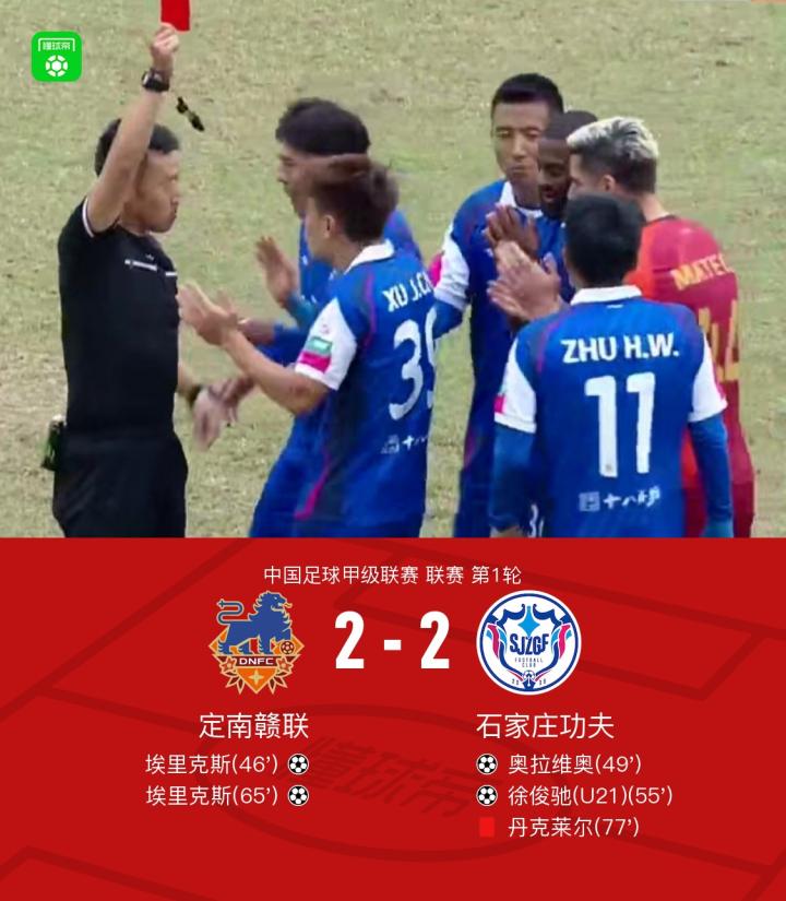 北京时间3月16日,中国足球甲级联赛第1轮展开争夺,定南赣联坐镇主场迎战石家庄功夫。下半场韦子弦传中,埃里克斯头球破门,随后奥拉维奥、徐俊驰各入一球帮助石家庄功夫反超比分,之后埃里克斯破门完成双响,之后的比赛丹克莱尔飞铲犯规,裁判直接出示红牌。最终定南赣联2-2战平石家庄功夫。