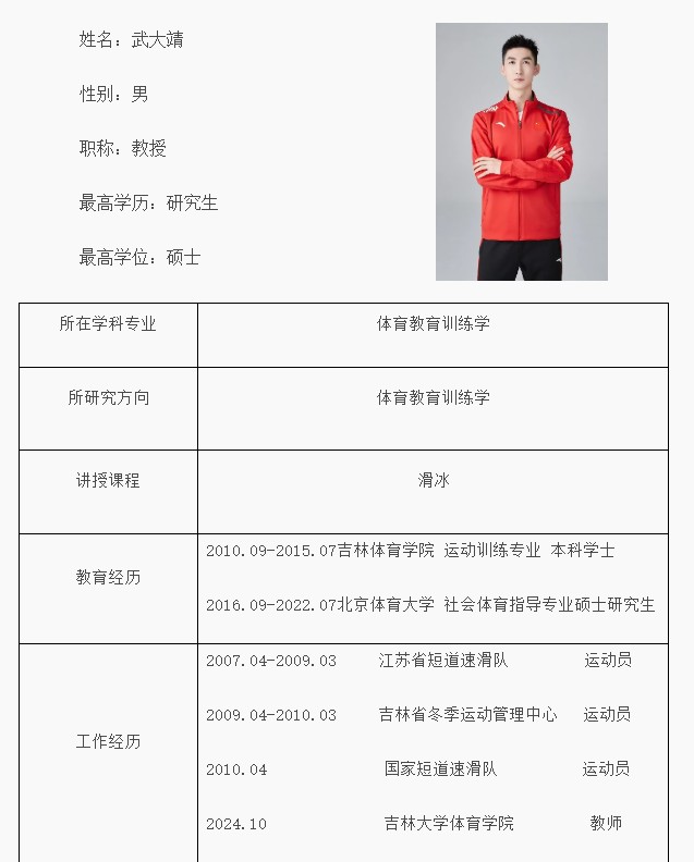奥运冠军武大靖已出任吉林大学体育学院教授,讲授滑冰课程南京伦敦体育场小杨 @懂球帝2025-03-16 17:17北京时间3月16日,据吉林大学体育学院网站“师资队伍”栏目更新后显示,武大靖已任吉林大学体育学院教授,研究方向为体育教育训练学,讲授课程为滑冰。据学院方面公布的资料,2010年到2015年,武大靖本科就读于吉林体育学院运动训练专业,2016年到2022年研究生就读于北京体育大学社会体育指导专业。工作经历方面,他先后担任吉林省冬季运动管理中心运动员和国家短道速滑队运动员。展开更多