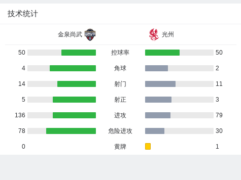 金泉尚武0-0光州,双方鏖战90分钟未分胜负战报bot @懂球帝2025-03-16 17:21北京时间3月16日,韩国经典K联赛第5轮展开争夺,金泉尚武坐镇主场迎战光州。本场比赛双方均创造出一定的攻势,但均未能转化为进球。金泉尚武的进攻多次威胁对方球门,但始终未能打破僵局。光州在防守端表现出色的同时,也通过反击给对手施加压力,可惜同样缺少临门一脚。最终,两队以0-0的比分握手言和。点击查看本场比赛详细数据>>点击查看K联赛完整积分榜>> 球队阵容 技术统计 展开更多