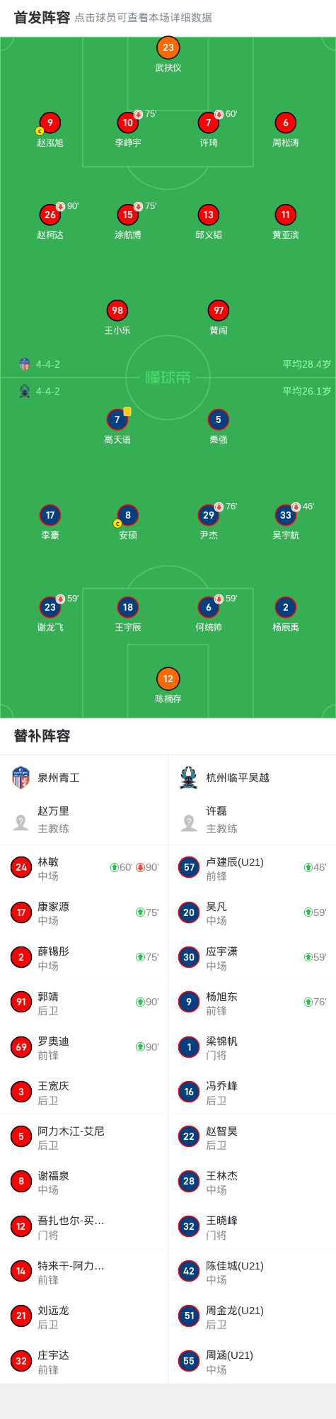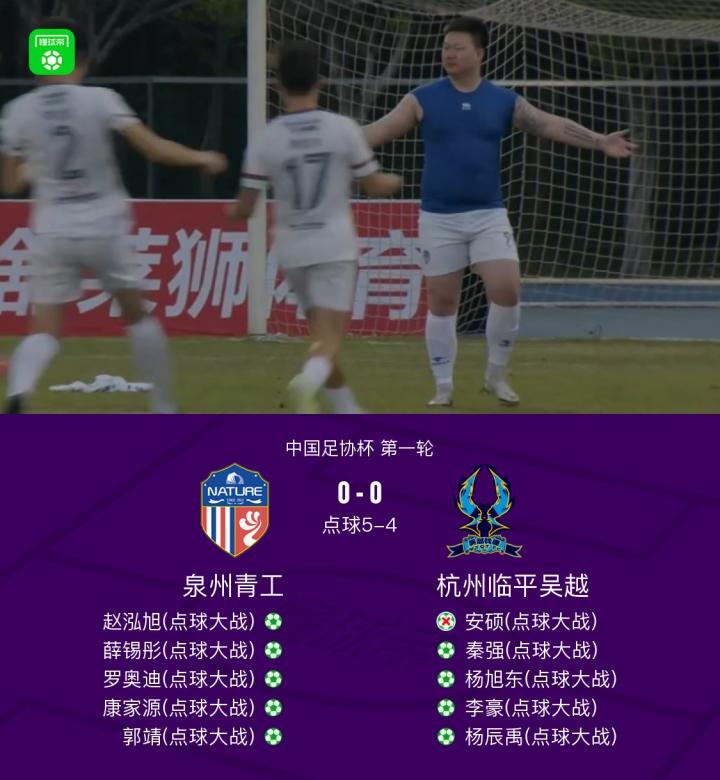足协杯泉州青工5-4点杀杭州临平吴越,郭靖、罗奥迪点球大战均罚进战报bot @懂球帝2025-03-16 17:52中国足协杯第一轮,泉州青工与杭州临平吴越展开较量。比赛通过点球大战决出胜负,过程中双方球员表现得极为坚韧。泉州青工方面,赵泓旭、薛锡彤、罗奥迪、康家源和郭靖先后将点球罚进;杭州临平吴越则由秦强、杨旭东、李豪和杨辰禹成功得分,但安硕的点球未能命中,最终泉州青工以5比4胜出。点击查看本场比赛详细数据>>点击查看足协杯完整积分榜>> 球队阵容 展开更多