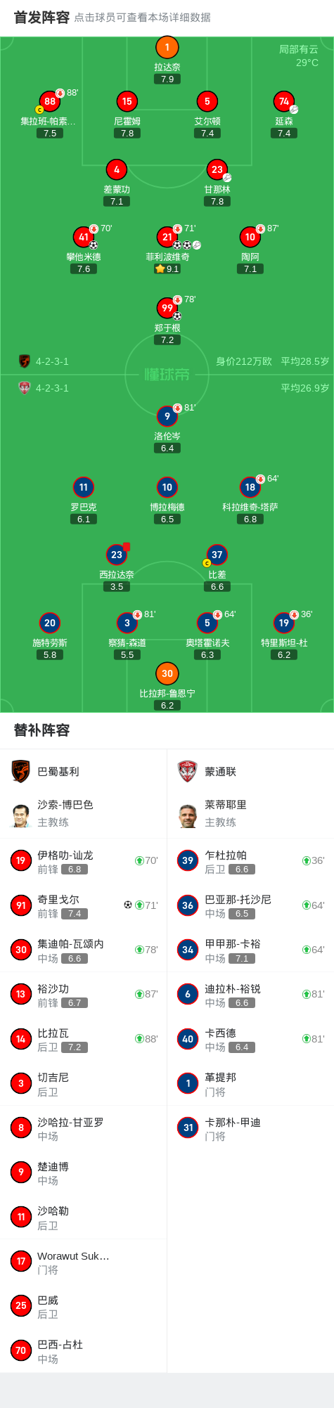 第20分钟,蒙通联球队西拉达奈吃到红牌。