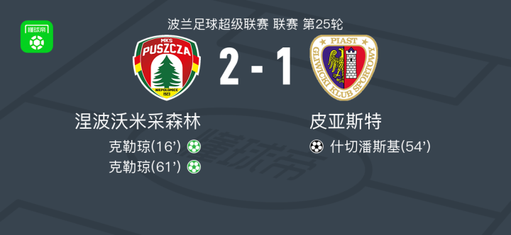 在波兰足球超级联赛第25轮的一场较量中,涅波沃米采森林坐镇主场迎战皮亚斯特。比赛中,涅波沃米采森林的克勒琼表现出色,两次通过点球机会成功将皮球送入对手网窝,完成梅开二度。皮亚斯特方面,什切潘斯基凭借泽达德卡的助攻打入一球,为球队扳回一分。最终,经过全场激战,涅波沃米采森林以2-1的比分战胜皮亚斯特,全取三分。