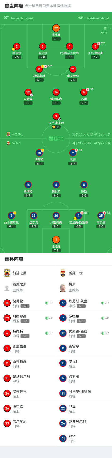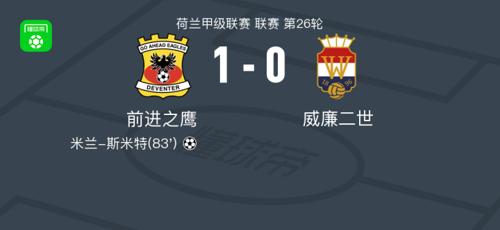 在北京时间3月16日进行的荷兰甲级联赛第26轮比赛中,前进之鹰坐镇主场迎战威廉二世。本场比赛,前进之鹰凭借米兰-斯米特的关键进球取得领先,这粒进球由安特曼送出助攻。最终,前进之鹰以1-0的比分战胜威廉二世,全取三分。