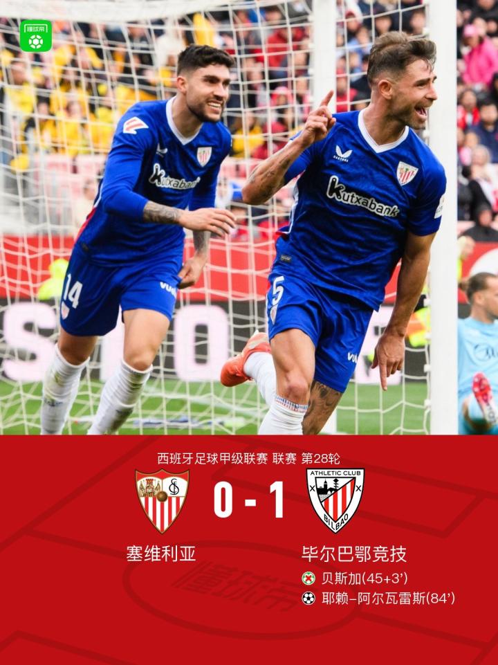 毕尔巴鄂1-0客胜塞维利亚,耶赖绝杀,贝斯加失点