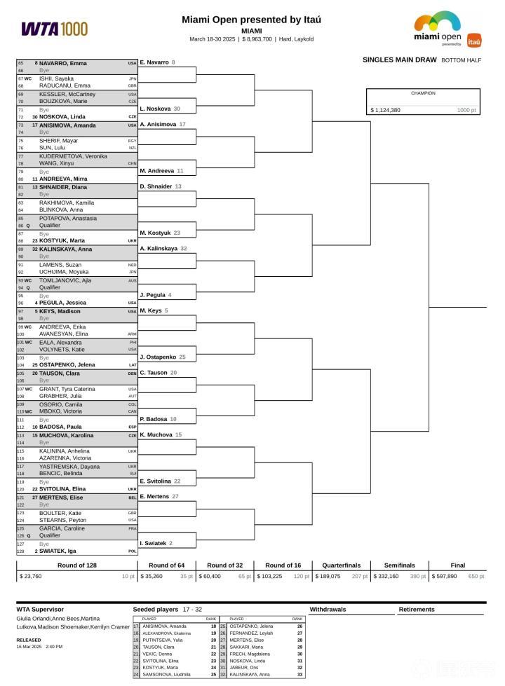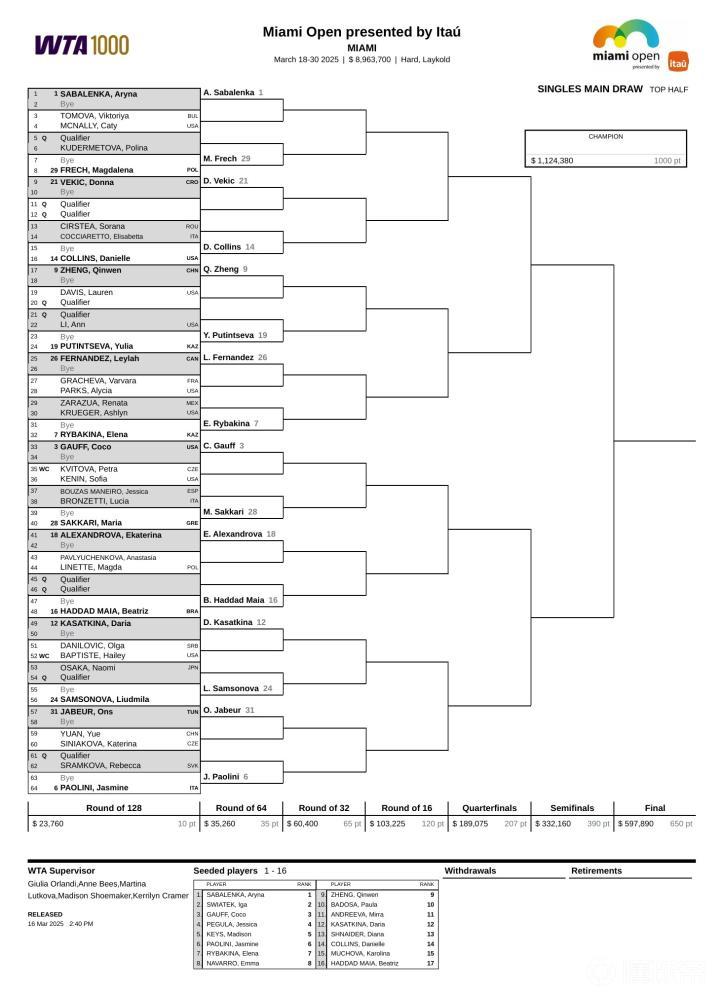 种子球员方面,卫冕冠军柯林斯作为14号种子出战,与郑钦文、萨巴伦卡与莱巴金娜同在上半区,下半区名将云集,斯瓦泰克、佩古拉、米拉-安德列娃、穆霍娃和凯斯齐聚。