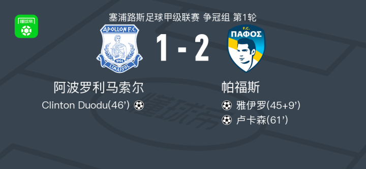 在北京时间3月17日进行的塞浦路斯足球甲级联赛争冠组首轮比赛中,阿波罗利马索尔坐镇主场迎战帕福斯。比赛中,帕福斯率先取得进球,雅伊罗为球队打破僵局。易边再战,阿波罗利马索尔迅速展开反击,Clinton Duodu成功破门扳平比分。然而,帕福斯随后再次掌控比赛节奏,卢卡森的进球帮助球队再度领先。最终,阿波罗利马索尔主场1-2不敌帕福斯。