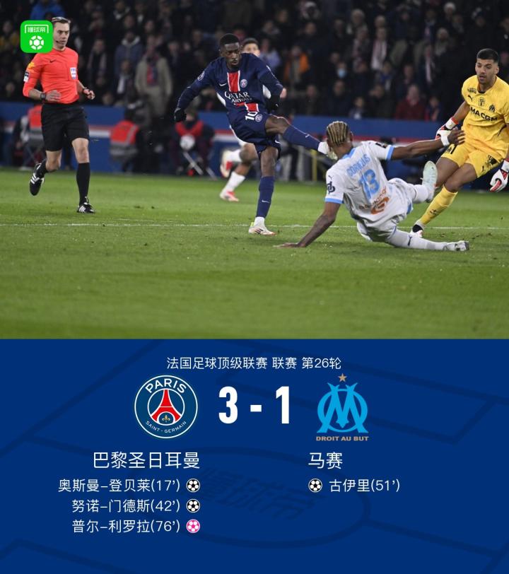 北京时间3月17日,法国足球顶级联赛第26轮,巴黎圣日耳曼坐镇主场迎战马赛。比赛开始后,巴黎圣日耳曼迅速占据主动,奥斯曼-登贝莱接队友法比安-鲁伊斯的妙传率先打破僵局。随后,努诺-门德斯再度利用一次精妙配合扩大领先优势。马赛并未轻易放弃,古伊里在进攻中抓住机会为球队扳回一城。然而,普尔-利罗拉在防守端出现失误,不慎将球送入自家球门,最终巴黎圣日耳曼以3-1战胜马赛,全取三分。