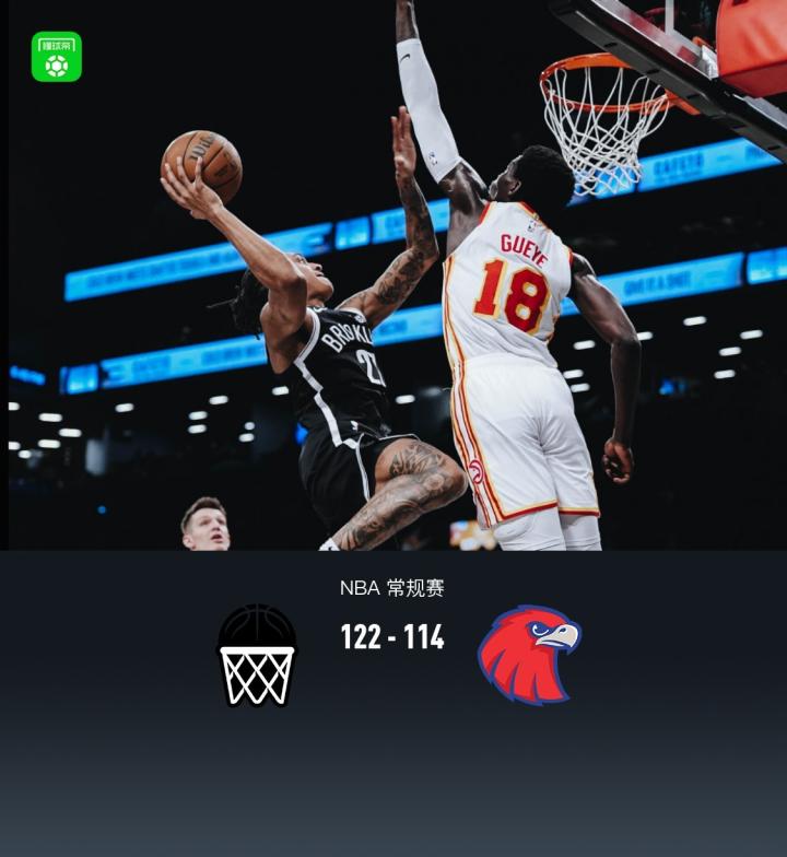 第四节篮网卡梅隆-约翰逊拿下10分,老鹰特雷-杨拿下7分,最终篮网122-114战胜老鹰