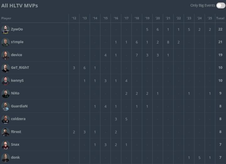 目前24岁的Mathieu “ZywOo” Herbaut以22个MVP头衔独自领跑CS赛事历史,s1mple与device分列二三位,NiKo排名第6,donk仅出道1年就获得7个MVP,暂时并列排在第10位。