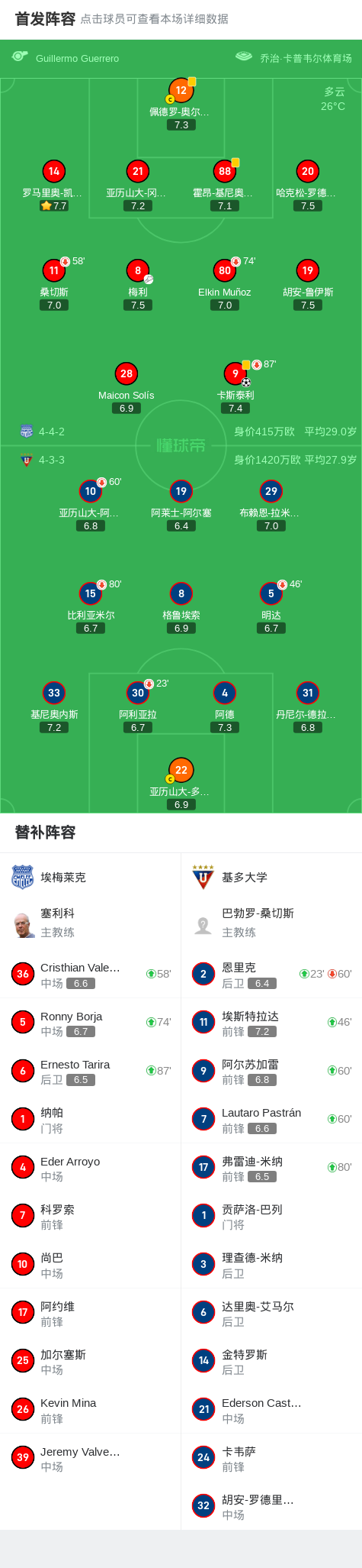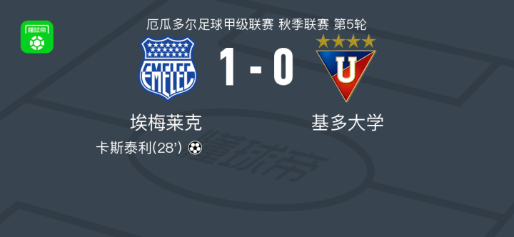北京时间3月17日,厄瓜多尔足球甲级联赛秋季联赛第5轮展开争夺,埃梅莱克坐镇主场迎战基多大学。比赛中,埃梅莱克凭借卡斯泰利的进球取得领先,这粒进球来自队友梅利的助攻。全场比赛结束,埃梅莱克以1-0战胜基多大学,成功收获三分。