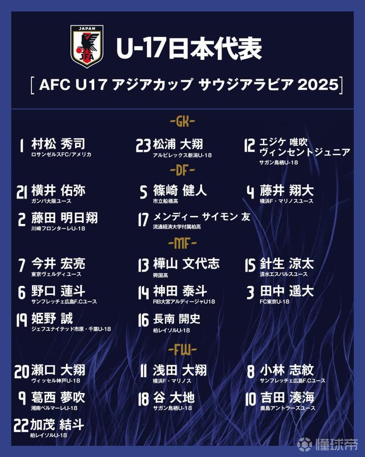 北京时间3月17日,日本足协公布了参加2025年U17亚洲杯的23人名单。