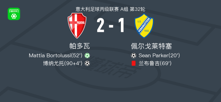 帕多瓦2-1逆转佩尔戈莱特塞,博纳尤托破门,Mattia Bortolussi点射