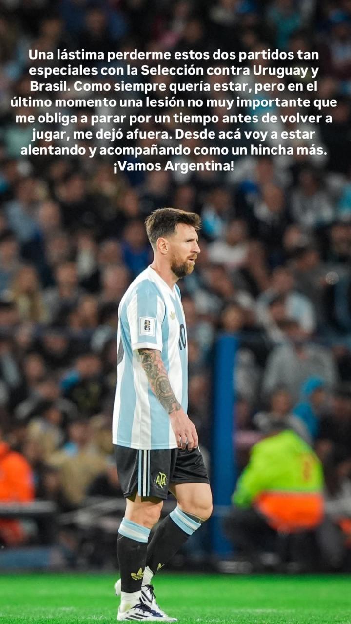 梅西在社交媒体发文表示:“很遗憾错过这两场如此重要的比赛,对手分别是乌拉圭和巴西。像往常一样,我本想参赛,但在最后一刻,一处不太严重的伤病迫使我在复出之前暂时停下脚步,这让我无缘比赛。