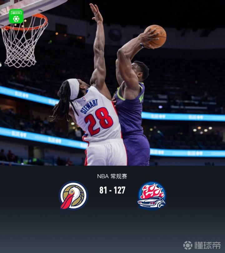活塞127-81狂胜鹈鹕,锡安空砍30分,麦科勒姆15投仅1中