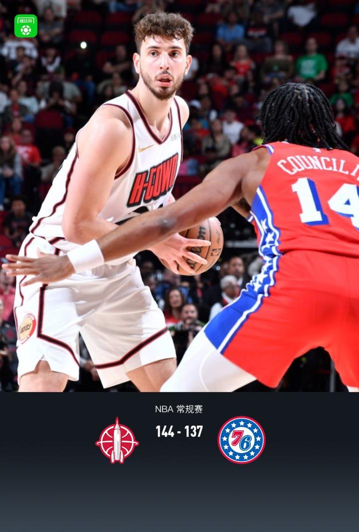 加时赛火箭申京拿下5分,76人格雷姆斯拿下6分,最终火箭144-137战胜76人