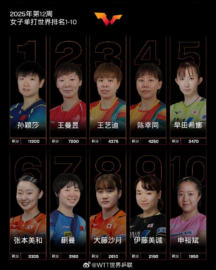 中国队球员孙颖莎、王曼昱、王艺迪、陈幸同位列前四,蒯曼位列第七。
