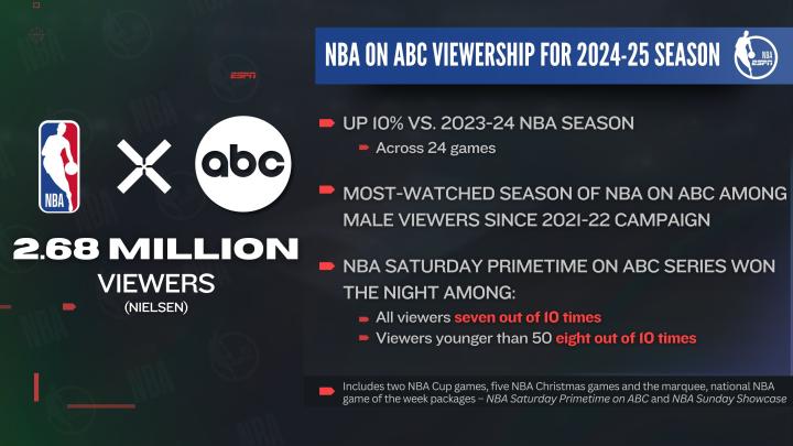 北京时间今日,据统计数据显示,美国ABC平台频道2024-25赛季NBA常规赛的收视率比上赛季增长了10%(统计样本为24场比赛)。