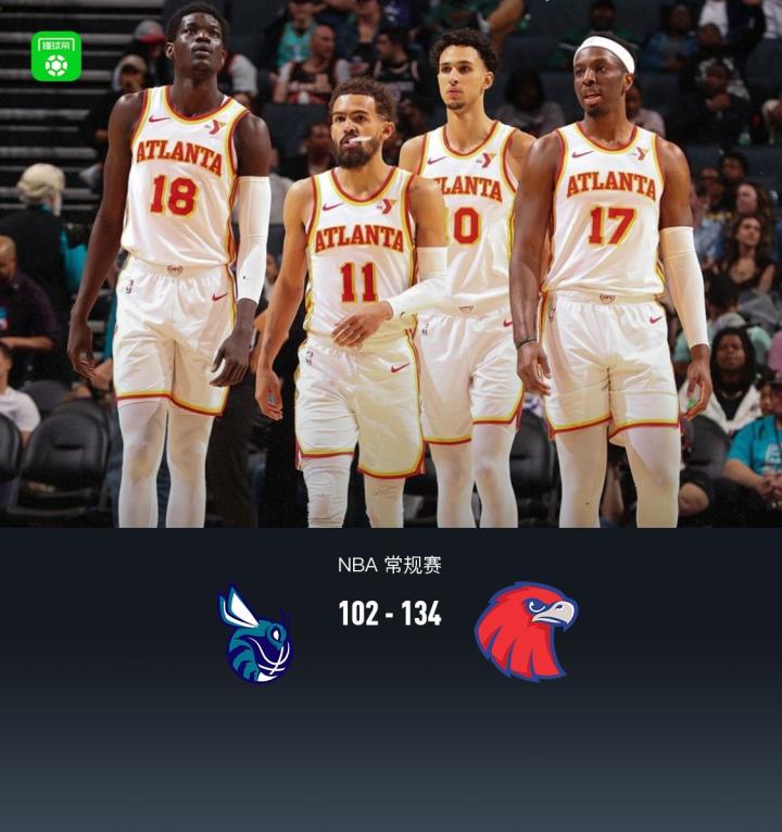 老鹰134-102大胜黄蜂,特雷-杨31+2+8,丹尼尔斯22+7+7