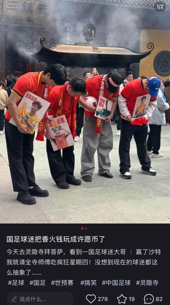 来点玄学,几位国足球迷在杭州灵隐寺参拜ZeroTsu_02 @懂球帝2025-03-19 13:56北京时间3月19日,小红书平台有用户发布了几张国足球迷在杭州灵隐寺参拜的照片。照片中,几位球迷手中拿着国足球员的照片,身穿国足球衣,戴着国足围巾,几人背后还贴着“就支持国足那咋了”的标语。北京时间3月21日凌晨2:15,世预赛18强赛第7轮,国足将在客场对阵沙特,3月25日晚19:00,世预赛18强赛第8轮,国足将在主场杭州奥体中心对阵澳大利亚。展开更多