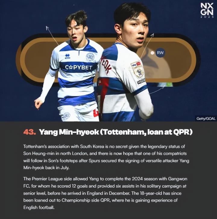 最后我们来看关于韩国国脚梁民革的消息。在梁民革加盟英超托特纳姆热刺后,外界一直期待梁民革的发展,但只有球队的主帅波斯特科格鲁不给他任何机会,并且看低他,以至于后者为了寻求出场机会,前往英冠租借。近日,英国媒体于18日(韩国时间)发布了“NXGN(Next Generation)2025”,评选出了2006年1月1日后出生的、被认为最具成长潜力的50名球员,其中现在效力于英冠QPR的梁敏革位列第43位,这也是继2016年的李升祐、2019和20年的李刚仁后,时隔5年再度有韩国球员入围该榜单。