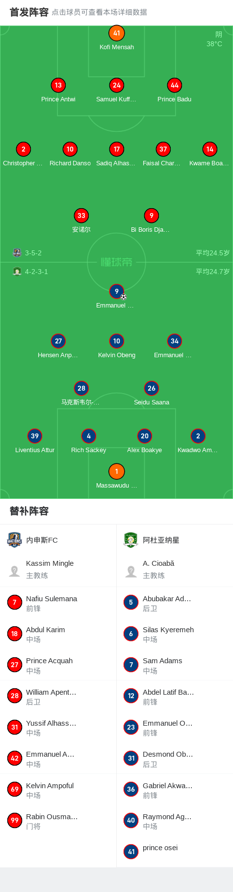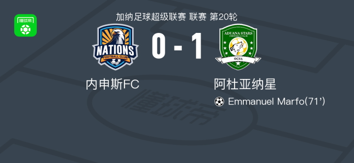 阿杜亚纳星1-0内申斯FC,Emmanuel Marfo助球队取胜战报bot @懂球帝2025-03-20 01:03北京时间3月19日,加纳足球超级联赛第20轮展开争夺,内申斯FC坐镇主场迎战阿杜亚纳星。比赛中,阿杜亚纳星凭借 Emmanuel Marfo 的关键进球取得领先。最终,内申斯FC以0-1不敌阿杜亚纳星。点击查看本场比赛详细数据>>点击查看加纳超完整积分榜>>精彩瞬间第71分钟,阿杜亚纳星球员Emmanuel Marfo打入一球。 球队阵容 展开更多
