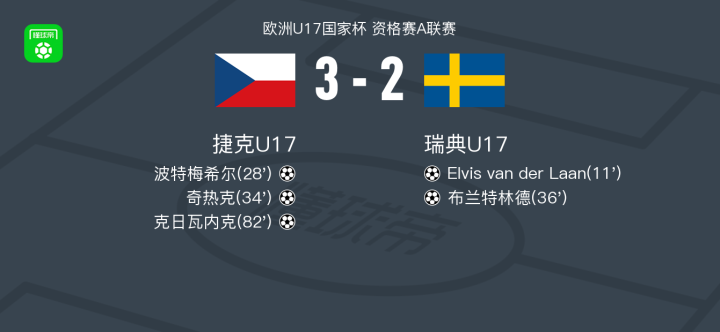 北京时间3月20日,欧洲U17国家杯资格赛A联赛展开一场较量,捷克U17与瑞典U17相遇。比赛中,瑞典U17凭借Elvis van der Laan的进球取得领先,但捷克U17迅速展开反击,波特梅希尔打入一球扳平比分,随后他又助攻奇热克完成反超。瑞典U17并未放弃,布兰特林德的进球帮助球队再度将比分追平。然而,捷克U17在比赛后段继续发力,克日瓦内克接Matous Srb的助攻打入关键一球,最终锁定胜局。全场比赛结束,捷克U17以3-2战胜瑞典U17。