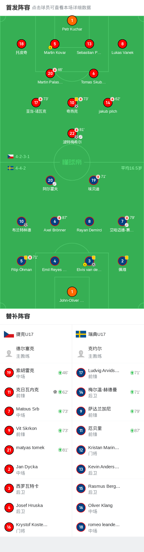 捷克U17 3-2逆转瑞典U17,克日瓦内克、奇热克破门