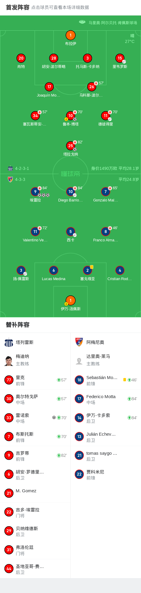 第16分钟,塔列雷斯球员德彼得里助攻塔拉戈纳打入一球。