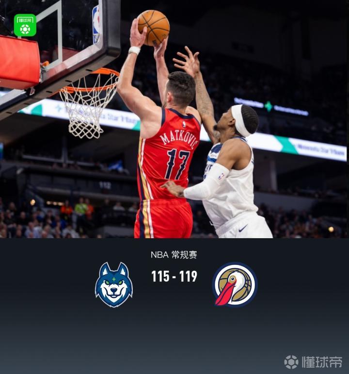 第四节森林狼纳兹-里德拿下4分,鹈鹕奥利尼克拿下8分,最终森林狼115-119不敌鹈鹕