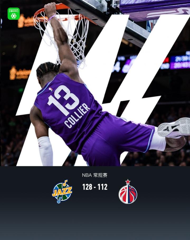 第四节爵士朱赞拿下9分,奇才科尔比-琼斯拿下7分,最终爵士128-112战胜奇才