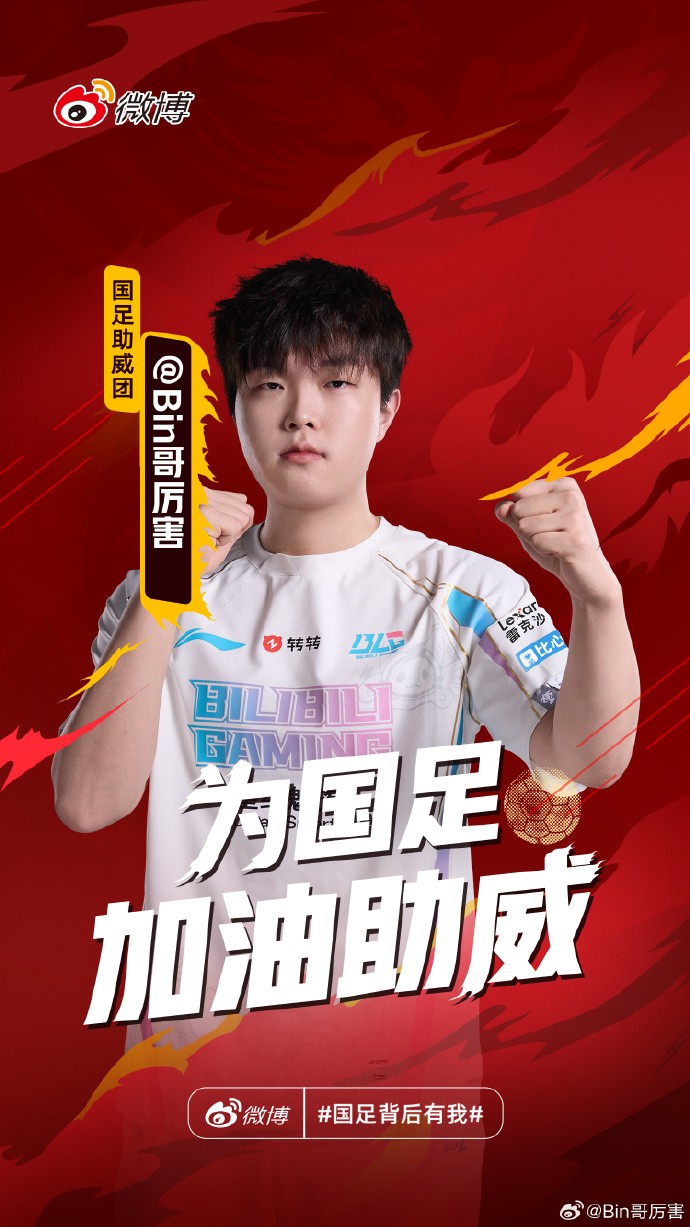北京时间3月20日,LPL战队BLG的选手Bin在社交媒体上发文为国足助威。