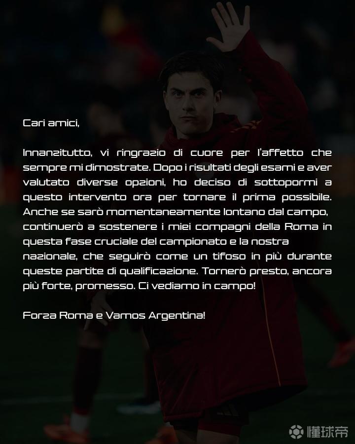 因手术赛季报销,迪巴拉:我将伤缺一段时间,会继续支持队友