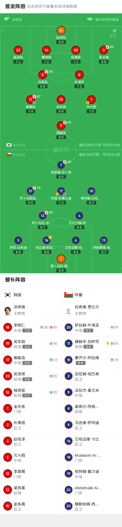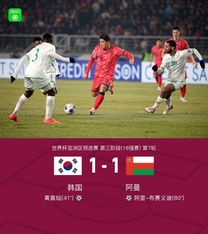 韩国1-1阿曼遭二连平,黄喜灿建功,李刚仁助攻+伤退