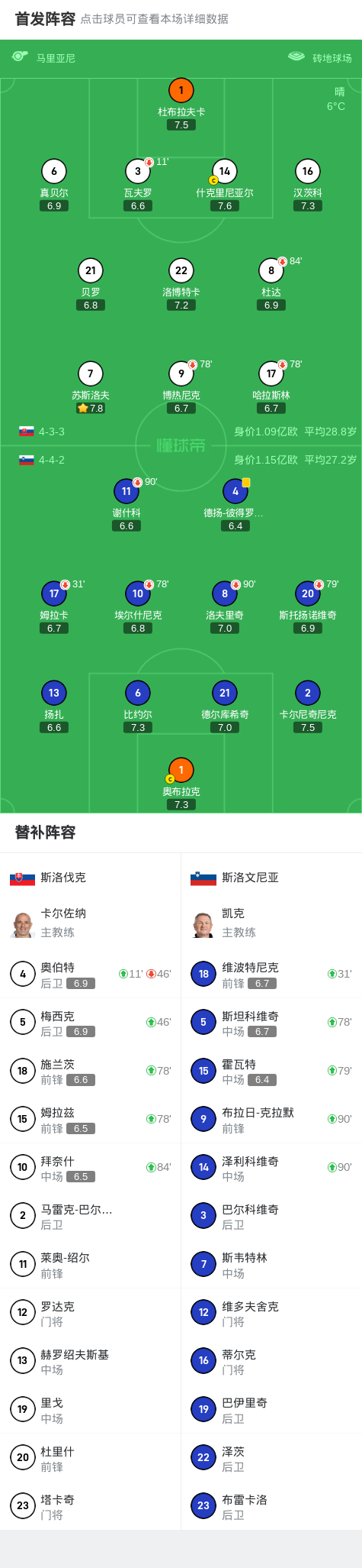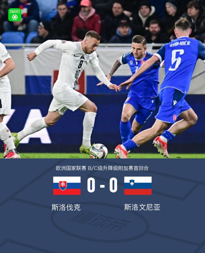斯洛伐克0-0斯洛文尼亚,双方互有攻守,场面略显平淡战报bot @懂球帝2025-03-21 05:42欧洲国家联赛B/C级升降级附加赛首回合,斯洛伐克与斯洛文尼亚展开较量。全场比赛双方均未能取得进球,最终两队以0比0的比分握手言和。斯洛伐克在比赛中尝试多次进攻,但未能转化为得分机会,而斯洛文尼亚同样在关键时刻缺乏破门手段,比赛在僵持中结束。点击查看本场比赛详细数据>>点击查看欧国联完整积分榜>> 球队阵容 技术统计 展开更多