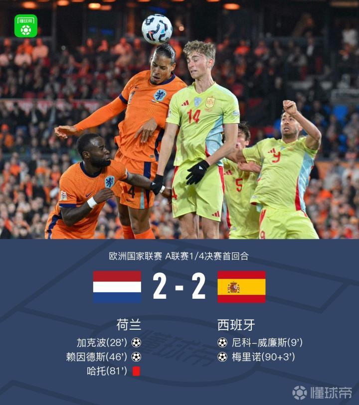 在欧洲国家联赛A联赛1/4决赛首回合的较量中,荷兰与西班牙展开激烈对决。比赛开始后,西班牙率先取得领先,尼科-威廉斯接到队友精准传球后成功破门。荷兰迅速调整状态,加克波在一次进攻配合中抓住机会扳平比分。随后,赖因德斯通过团队协作再下一城,帮助荷兰将比分反超。然而,在比赛进入尾声阶段时,哈托因严重犯规被裁判出示红牌罚下,导致场上局势发生变化。补时阶段,西班牙梅里诺挺身而出,用一粒关键进球将比分最终定格为2-2,双方握手言和。