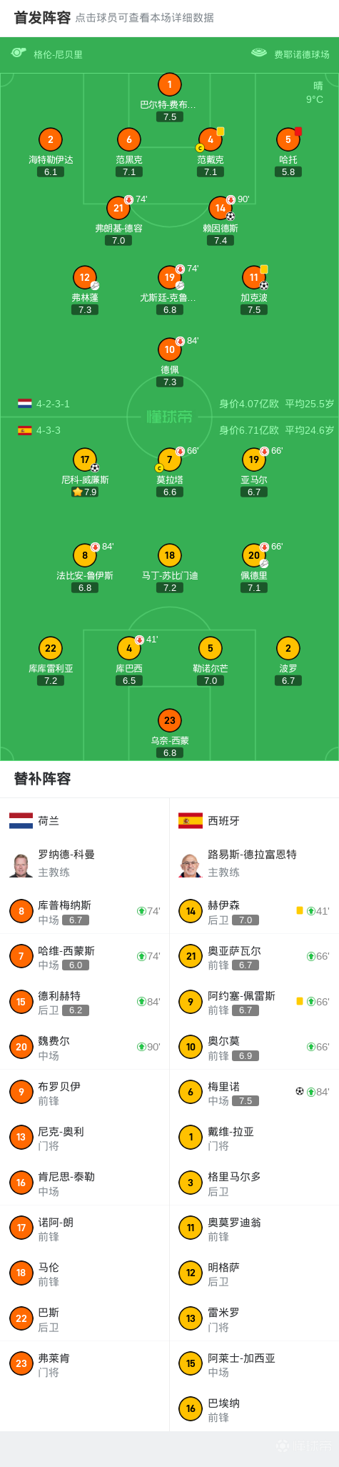 第9分钟,佩德里助攻,尼科-威廉斯破门先拔头筹,西班牙1-0荷兰