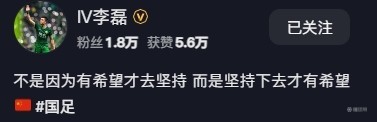 世预赛亚洲区18强赛第7轮角逐,中国男足客场0-1不敌沙特队。此役遭遇失利后,国脚李磊在社交媒体里表示:“不是因为有希望才去坚持,而是坚持下去才有希望🇨🇳”