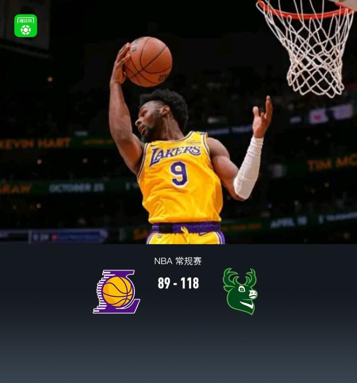 第四节,雄鹿字母哥提前打卡休息,开节雄鹿在库兹马、大洛领衔下迅速拉开至30分,随后雄鹿彻底换下主力,最终湖人89-118不敌雄鹿。