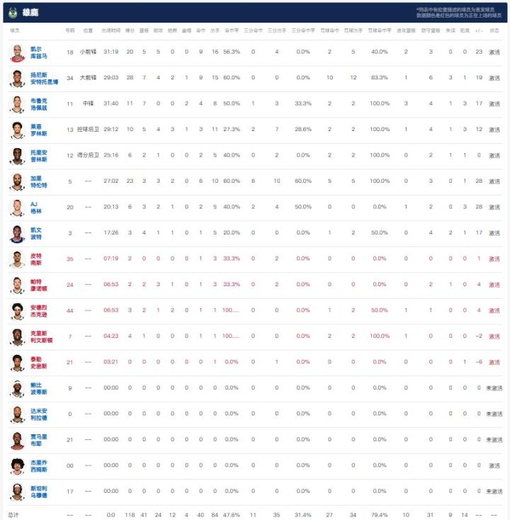 密尔沃基雄鹿字母哥28分7板4助2断1帽,特伦特23分3板3助2断,库兹马20分5板5助。