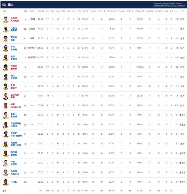 洛杉矶湖人克内克特17分4板3助1断,布朗尼-詹姆斯17分3板5助1帽,亚历克斯-莱恩10分9板1助1断;