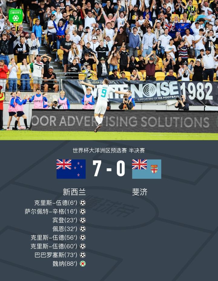 离世界杯还差一场胜利!新西兰7-0狂胜斐济,克里斯-伍德戴帽