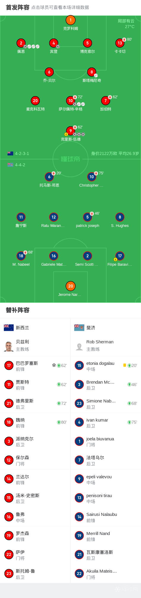 第73分钟,新西兰球员德弗里斯助攻巴巴罗塞斯打入一球。