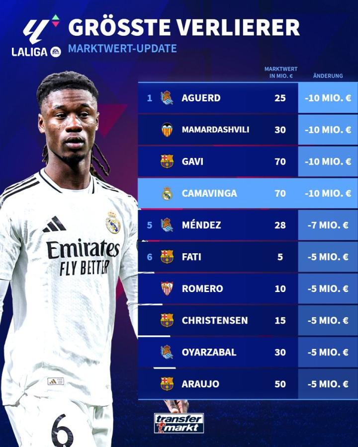 德国转会市场网站更新了西甲球员的身价,并列出西甲球员身价下跌榜前十,加维、卡马文加、马马尔达什维利和阿格尔德等人下跌1000万欧最多。
