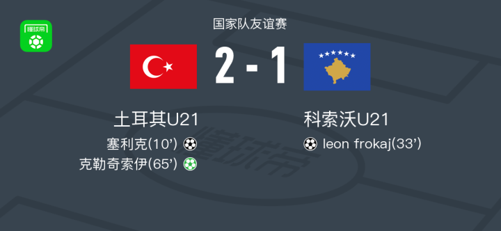 北京时间3月22日国家队友谊赛,土耳其U21对阵科索沃U21。土耳其U21塞利克破门,克勒奇索伊破门。科索沃U21leon frokaj破门。最终比分土耳其U21 2-1 科索沃U21。