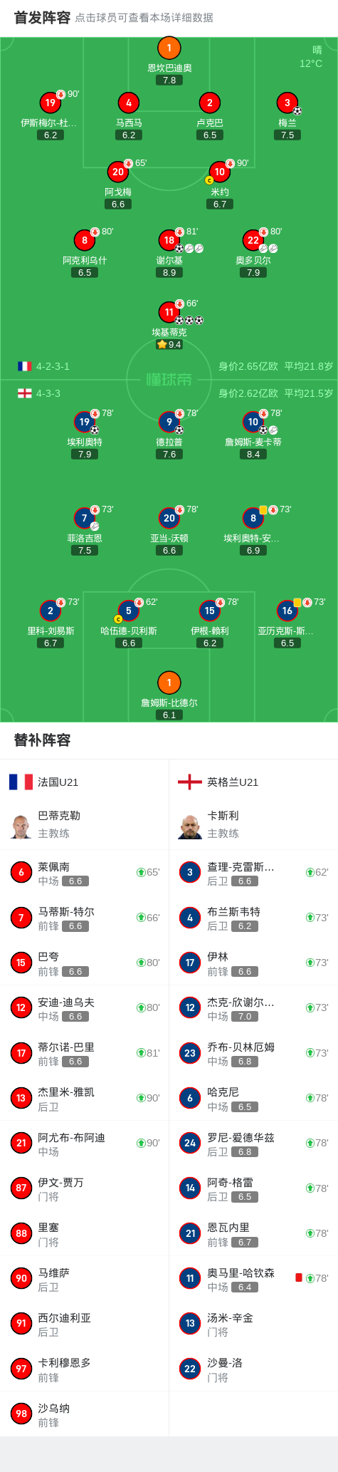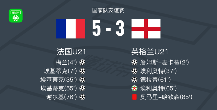 北京时间3月22日国家队友谊赛,法国U21对阵英格兰U21。法国U21梅兰破门,埃基蒂克帽子戏法,谢尔基破门。英格兰U21詹姆斯-麦卡蒂破门,埃利奥特破门,德拉普破门。最终比分法国U21 5-3 英格兰U21。