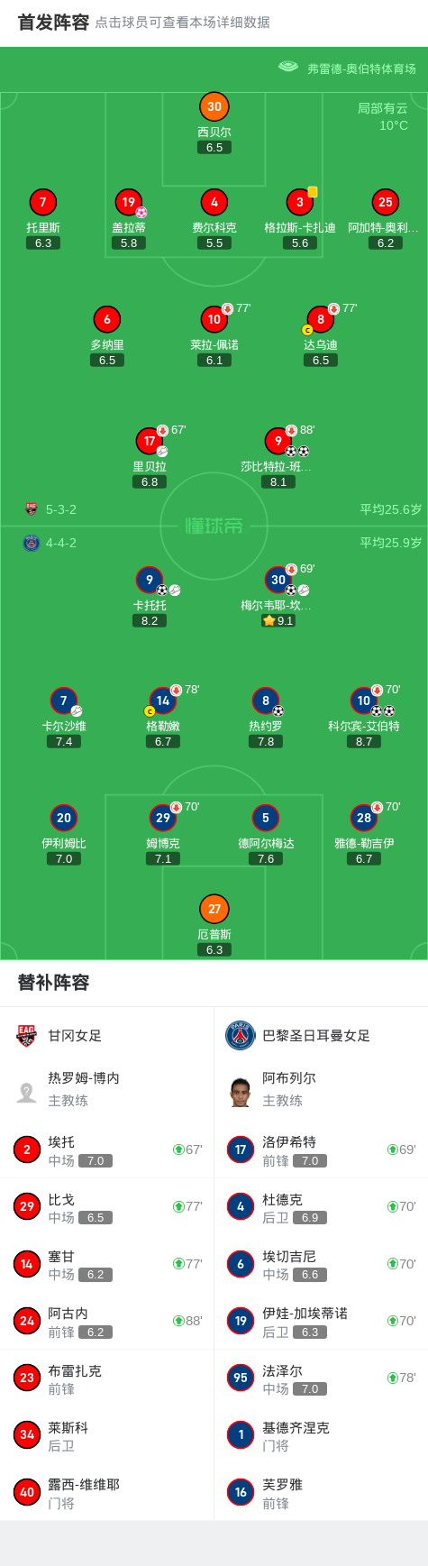 巴黎圣日耳曼女足6-2大胜甘冈女足,科尔宾-艾伯特两球,卡托托1传1射